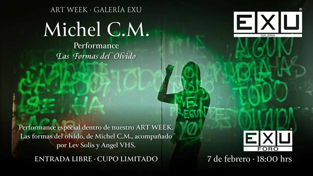 Como parte de la programación de Art Week en Galería EXU × Villa San Jacinto, el encuentro se expandió hacia Foro EXU con la presentación de Las formas del olvido, performance del artista Michel C.M., que ofreció al público una experiencia profundamente sensorial e inmersiva.